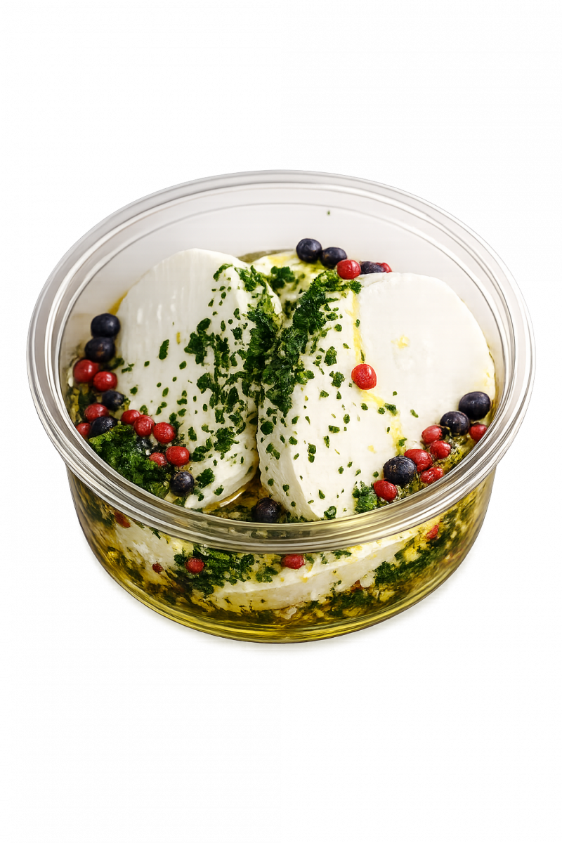 Fromage de chèvre frais dans de l'huile de colza avec baies roses, baies de genièvre, et ail et fines herbes fraîche (200g)