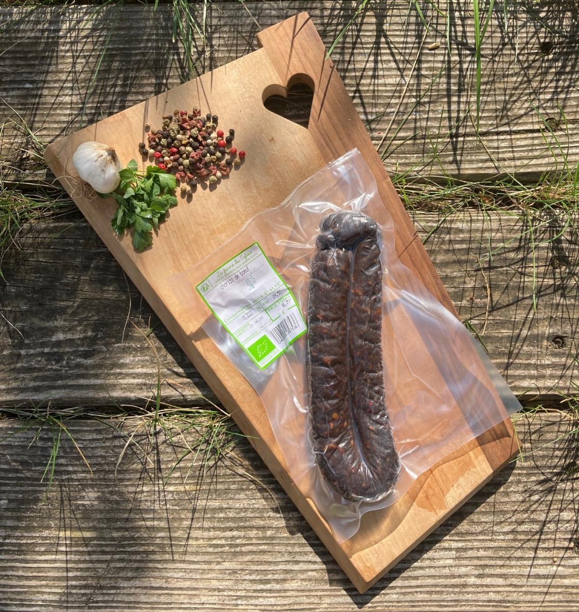 Nos animaux sont nourris à l'herbe. Nous sommes certifiés par ECOCERT, la fabrication du saucisson est contrôlée par ECOCERT également.