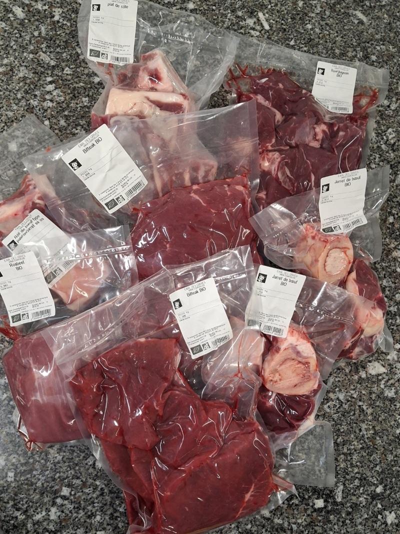 dont 2 de bourguignon ,1kg de rôti à bouillir ,1kg de jarret de boeuf, 2 kg de plat de côte,3 kg de steaks et 1 kg de rosbif