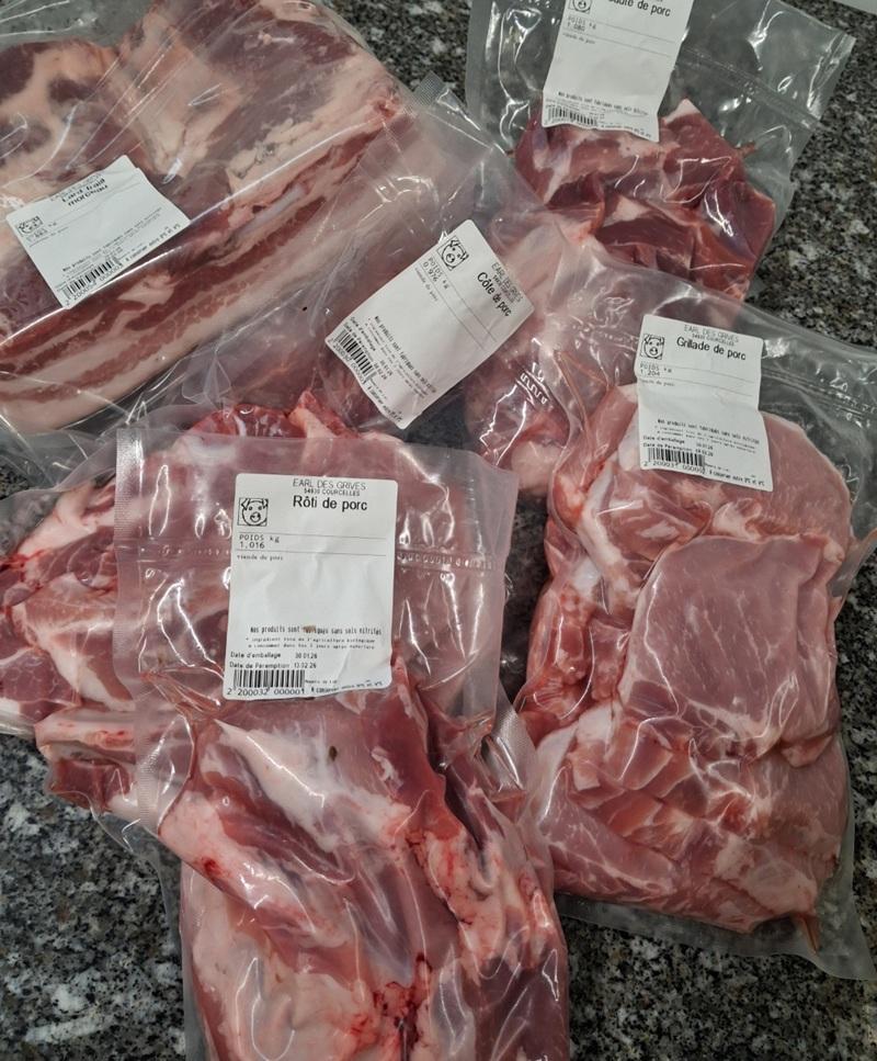 colis de viande de porc de 5 kg avec 1kg de côtes, 1kg sauté, 1kg grillades, 1kg lard frais et 1kg de rôti