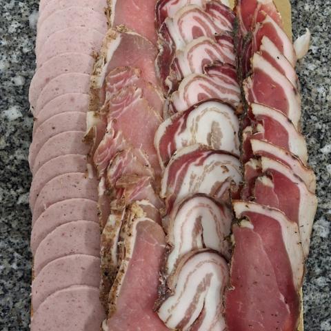 Spécialité : La "paysanne" petite saucisse assaisonnée ail des ours et tomate, le boudin noir du traditionnel chons oignons etc, le jambon blanc, simple avec couenne et bien sur un peu de gras; et bien d'autres choses à essayer.
