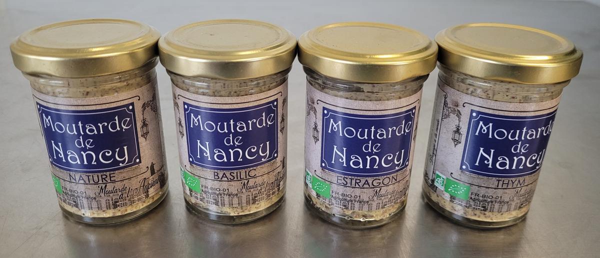 Moutarde de Nancy : c'est une création issue de son expérience bourguignonne et de sa détermination à faire ressortir le meilleur d'une terre. La moutarde est cultivée sur ses terres biologiques à Amance, il y a de la jaune et de la brune, cette culture est très favorable pour les abeilles en floraison. Les moutardiers ainsi que les vignerons ont disparus de Nancy, un hommage historique à notre terroir...