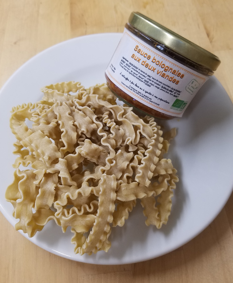 250g de mafaldines fraîches et un pot de 180g de sauce bolognaise cuisinée avec notre viande.