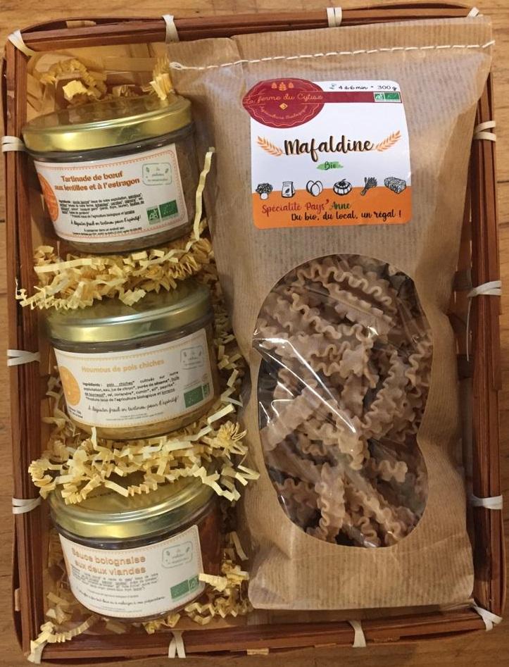 Un panier garni avec nos produits secs à mettre sous le sapin, pour un noël 100% bio et local !